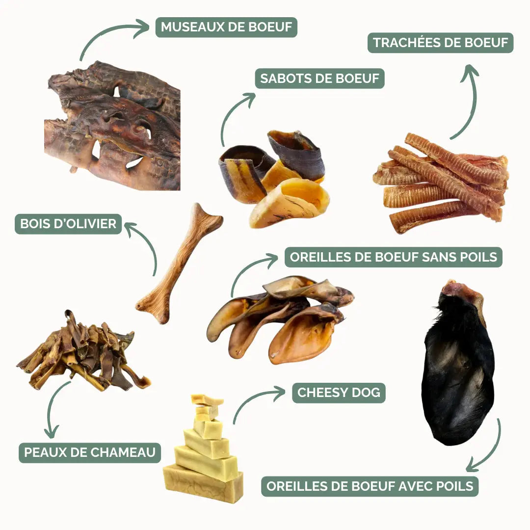 ✨ Sélection Variée et Naturelle 🌿 : Chaque friandise est sélectionnée pour sa qualité et ses bienfaits. Riches en protéines, pauvres en matières grasses et sans additifs ni conservateurs.
